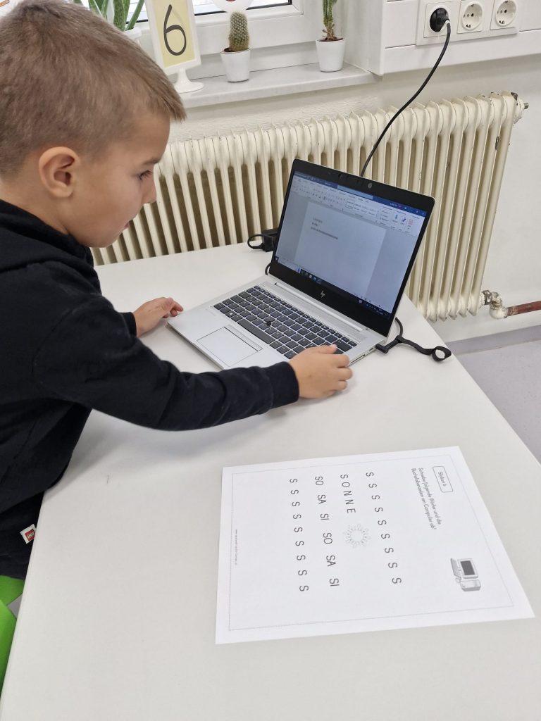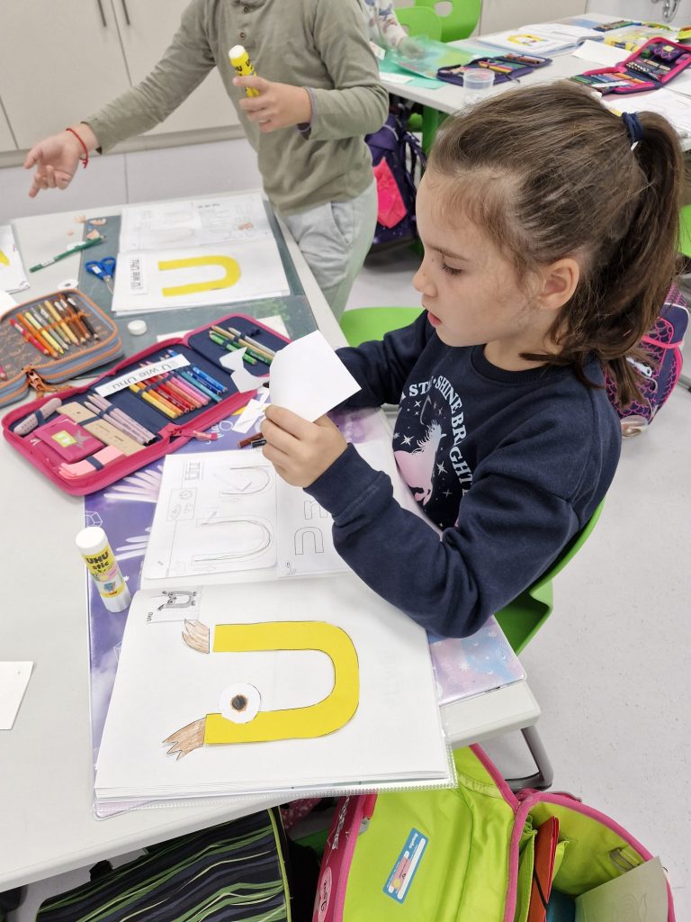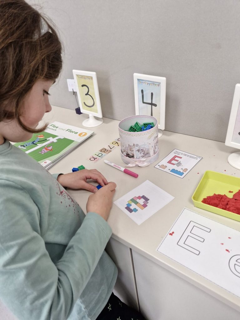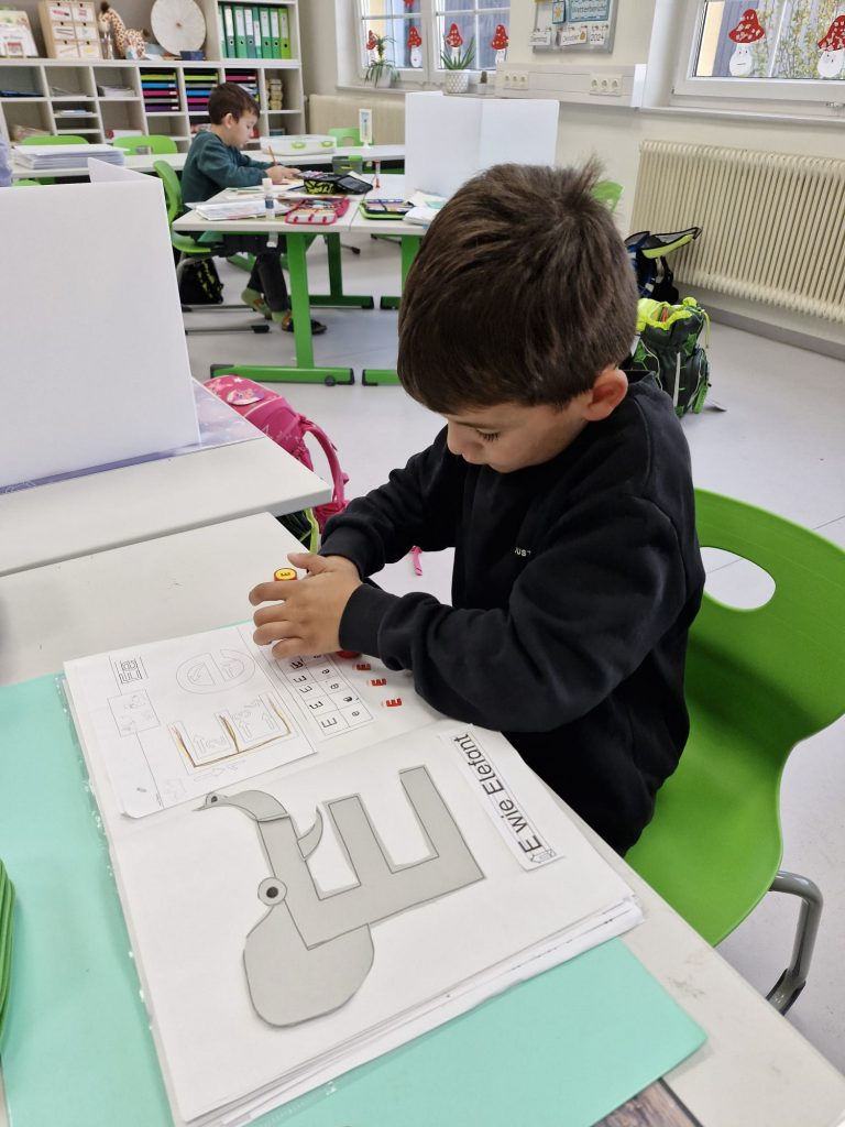 In der Klasse der 1b dreht sich für die Kinder jede Woche alles um einen neuen Buchstaben. Dabei geht es nicht nur um das richtige Schreiben und die Zuordnung des Schriftzeichens zum entsprechenden Laut, sondern auch um Einbeziehung möglichst vieler Sinne. Denn Buchstaben kann man auch ertasten, schmecken, fühlen, mit dem Körper darstellen oder riechen. Der Spaß darf dabei nicht zu kurz kommen. Passende Geschichten, Basteleien, Lieder und Reime runden die Buchstabenerarbeitung ab.