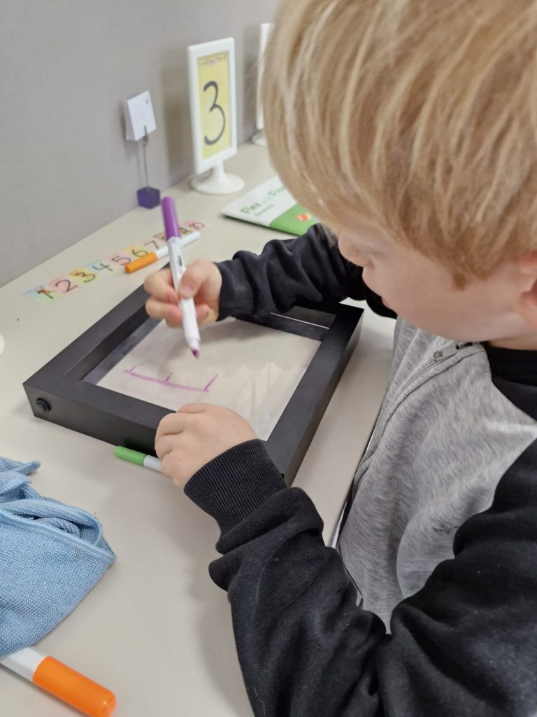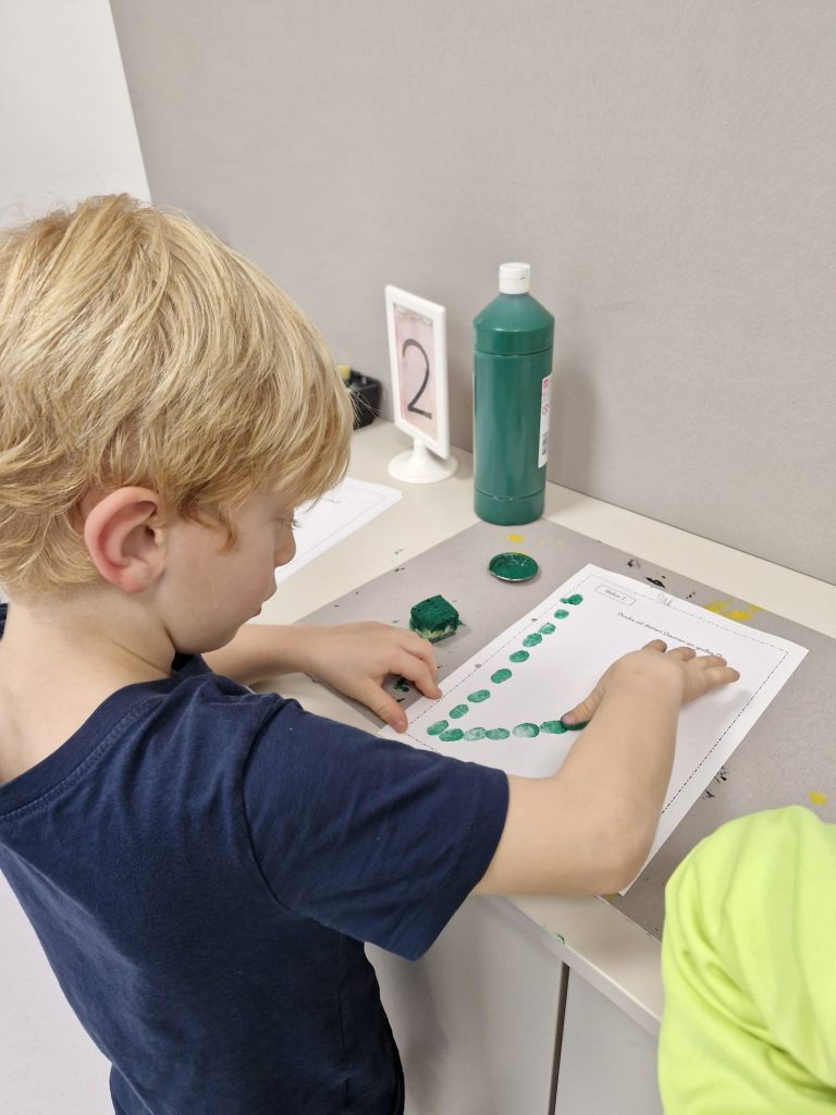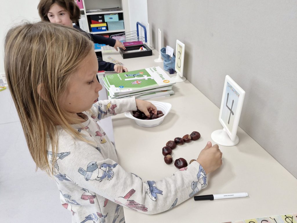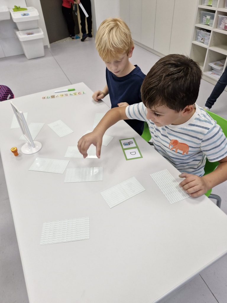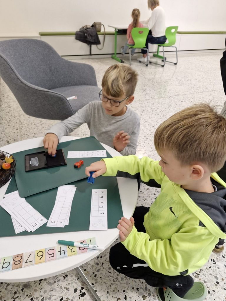 In der Klasse der 1b dreht sich für die Kinder jede Woche alles um einen neuen Buchstaben. Dabei geht es nicht nur um das richtige Schreiben und die Zuordnung des Schriftzeichens zum entsprechenden Laut, sondern auch um Einbeziehung möglichst vieler Sinne. Denn Buchstaben kann man auch ertasten, schmecken, fühlen, mit dem Körper darstellen oder riechen. Der Spaß darf dabei nicht zu kurz kommen. Passende Geschichten, Basteleien, Lieder und Reime runden die Buchstabenerarbeitung ab.