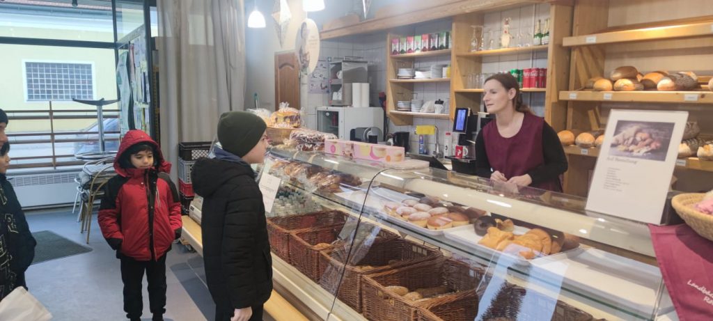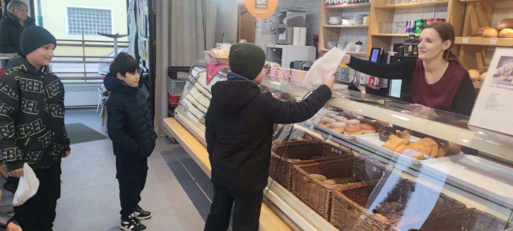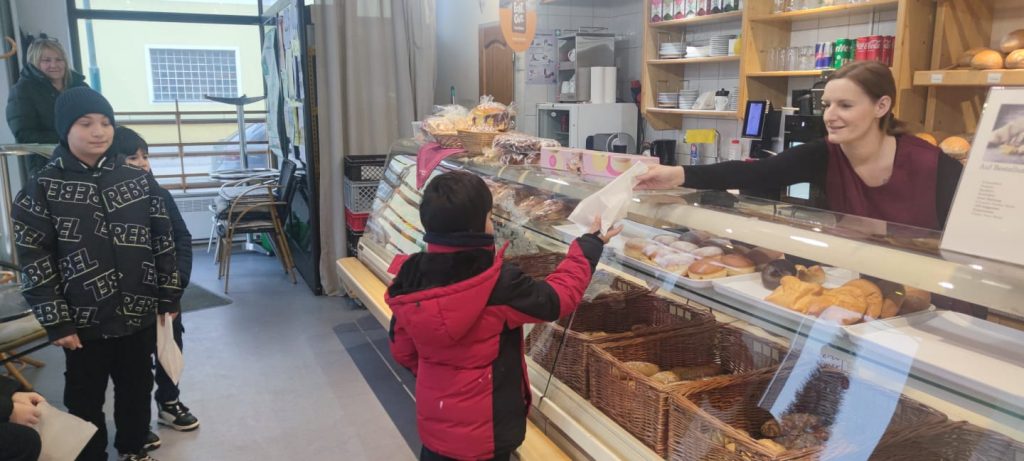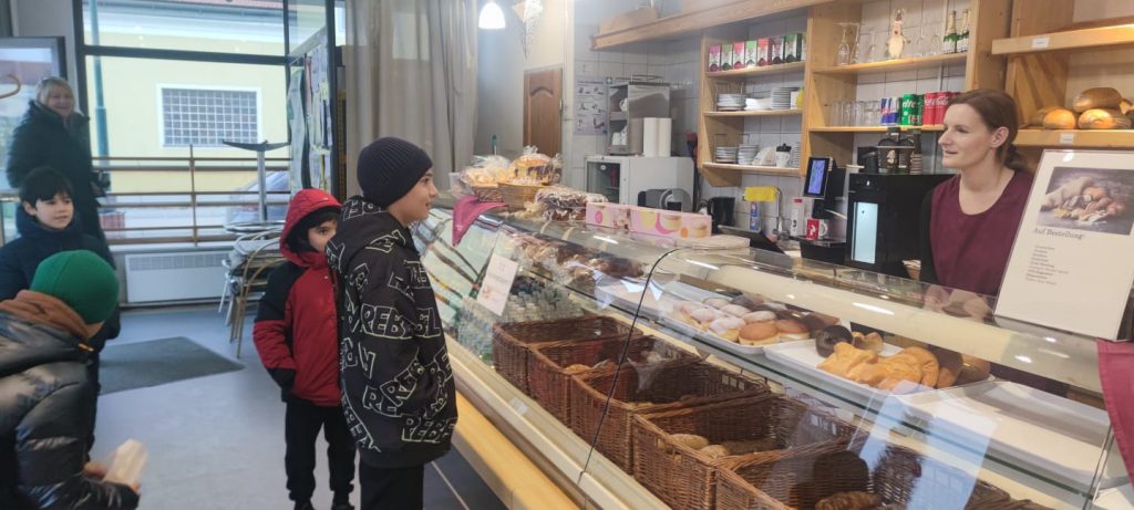 Am 26.11.2024 besuchte die Deutschförderklasse mit ihrer Lehrerin Katrin Taibl die Bäckerei Römer. Nachdem vorab in Rollenspielen die Bestellung eines Gebäckstücks geübt wurde, durften die Kinder selbst in der Bäckerei bestellen. Die Freude war groß und das Gebäck wurde im Anschluss stolz verspeist.