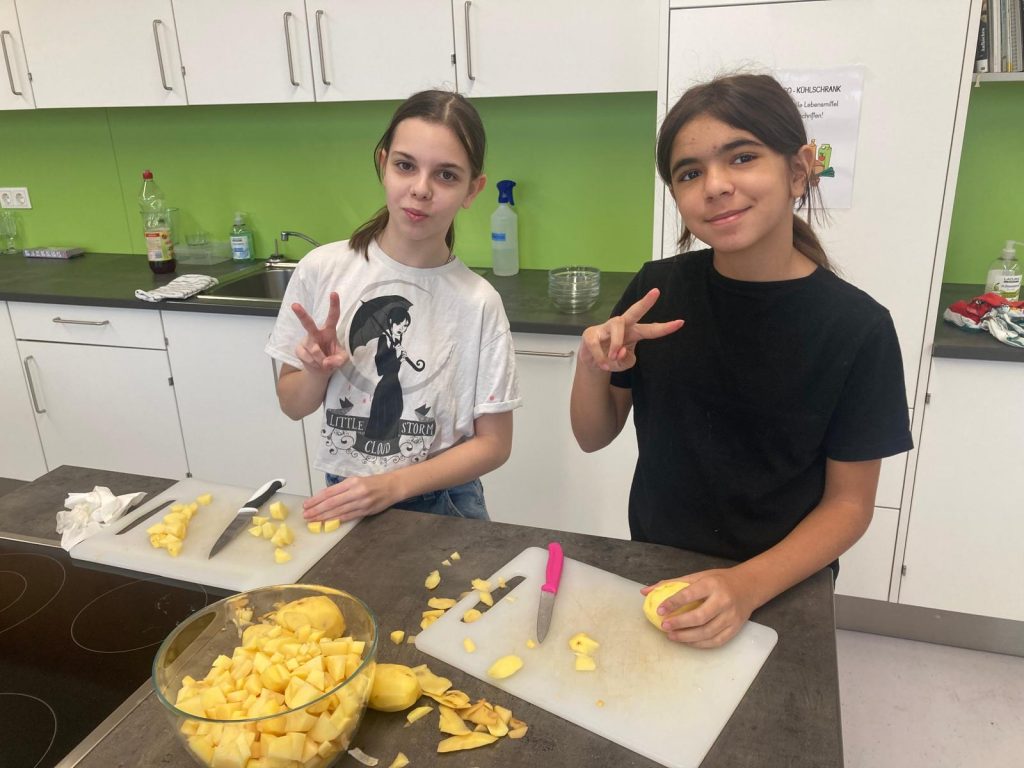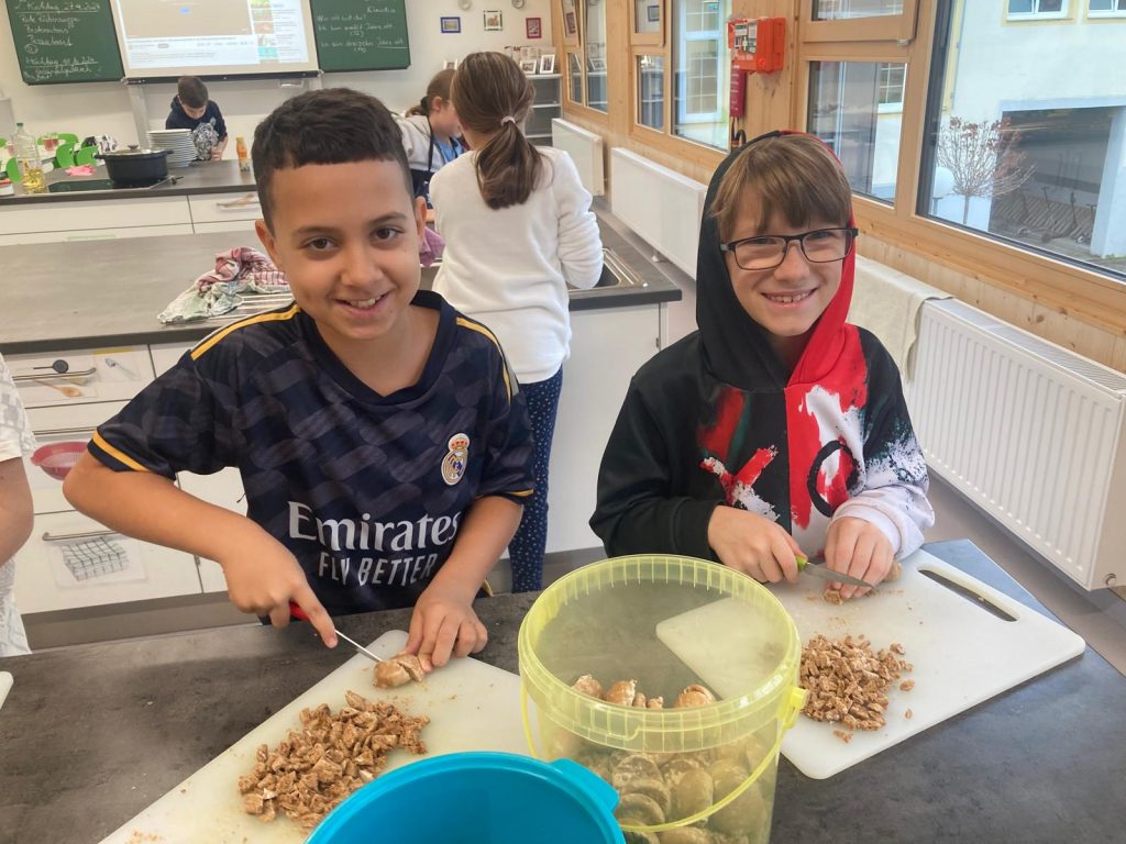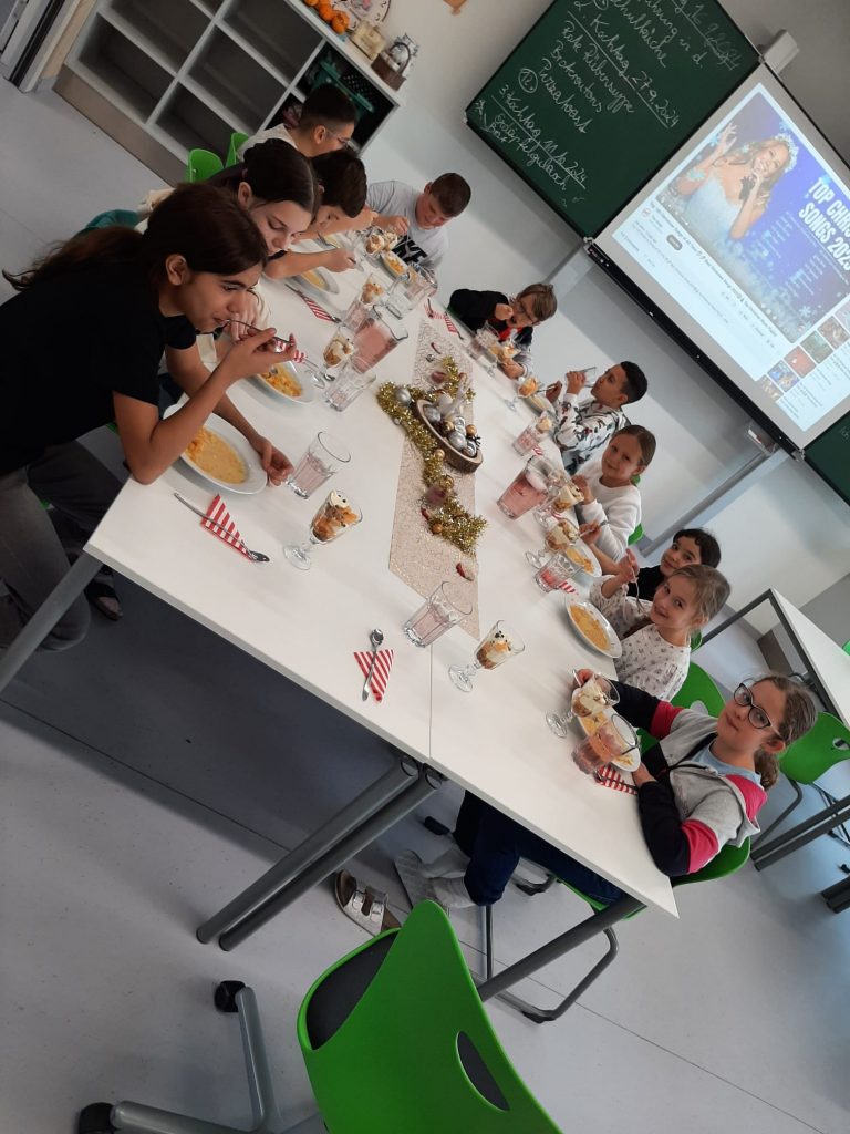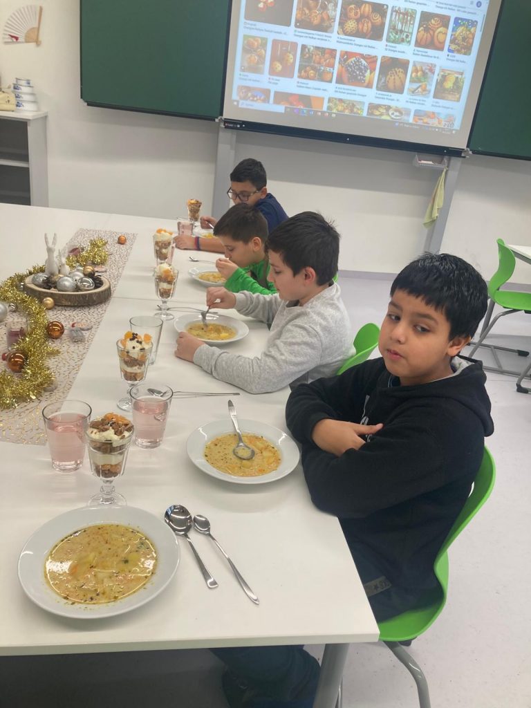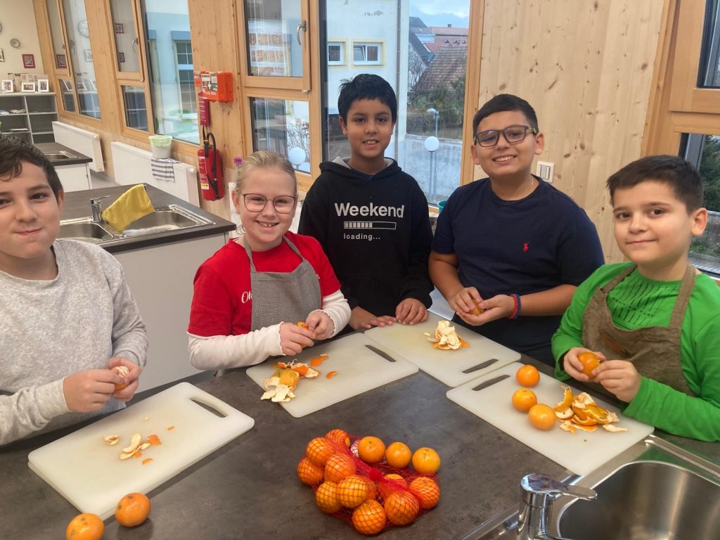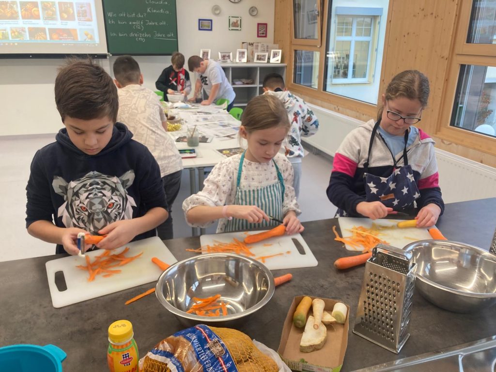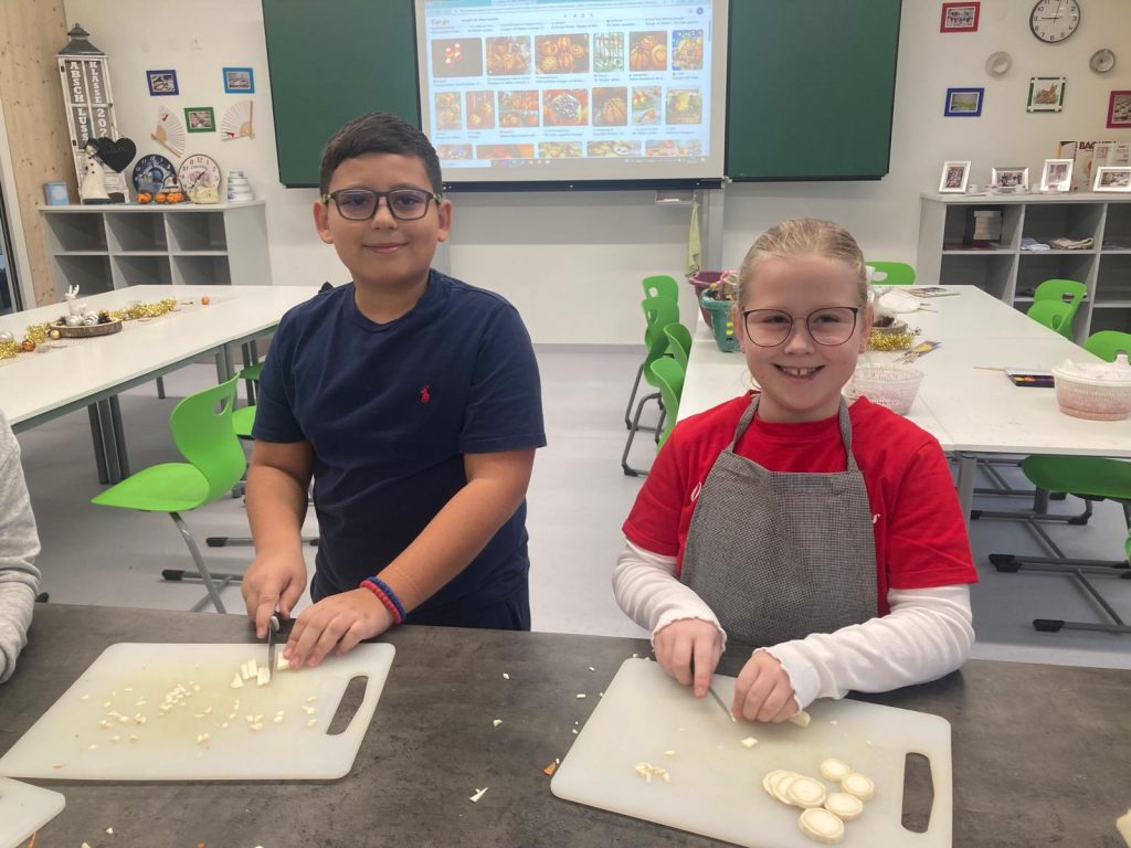 Am 29.11. und 6.12. schnupperte die vierte Klasse „Mittelschulluft“ im Rahmen der Nahtstellenstunden. Dabei sollten erste Berührungspunkte für den neuen Schulabschnitt geknüpft werden. Die Kinder kochten und verzehrten (aufgeteilt in zwei Gruppen) gemeinsam mit Frau Fachlehrerin Bettina Gaida eine schmackhafte Erdäpfelsuppe und als Nachspeise eine köstliche Mandarinen-Lebkuchencreme und hatten sichtlich Spaß beim Kochen.