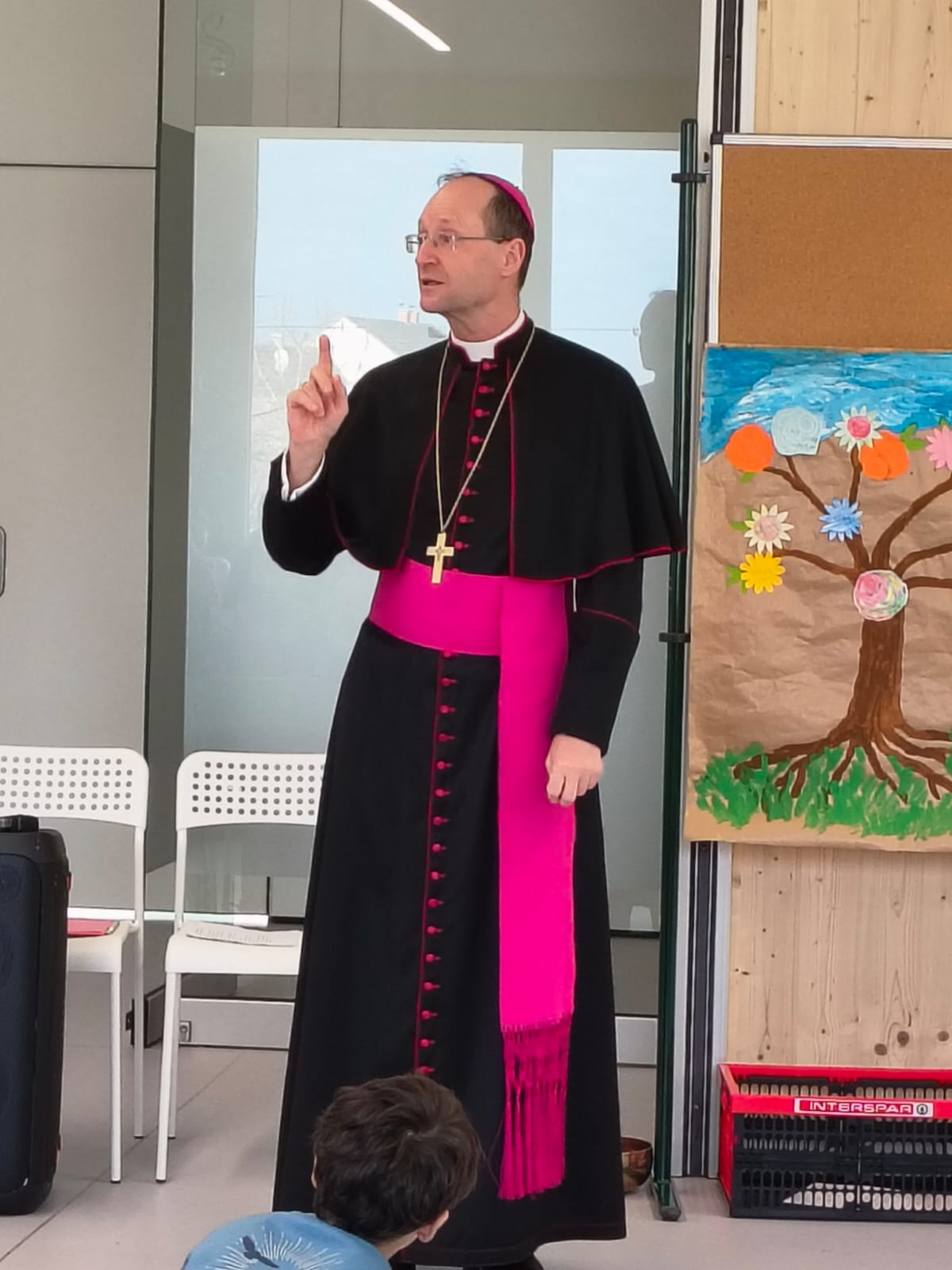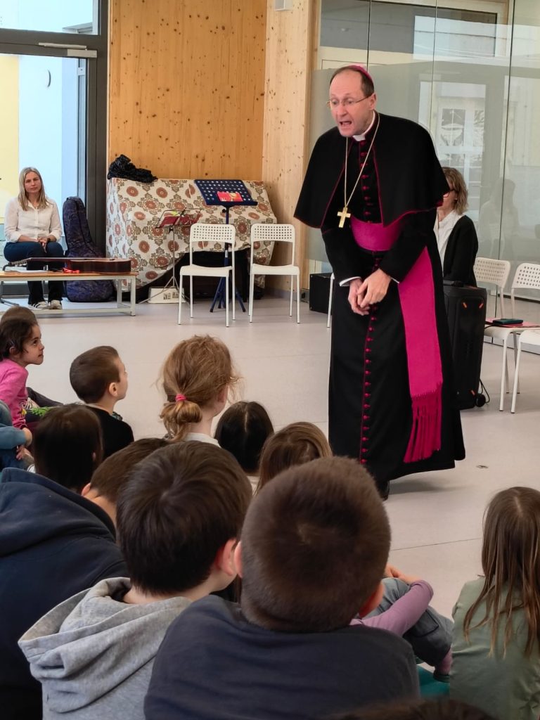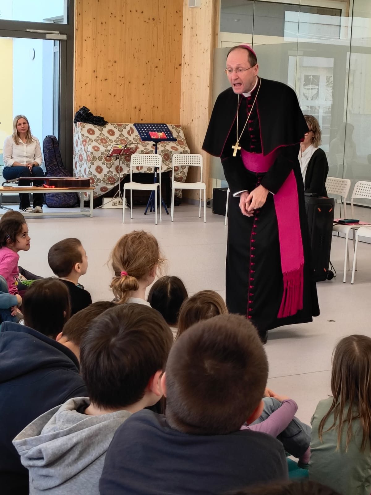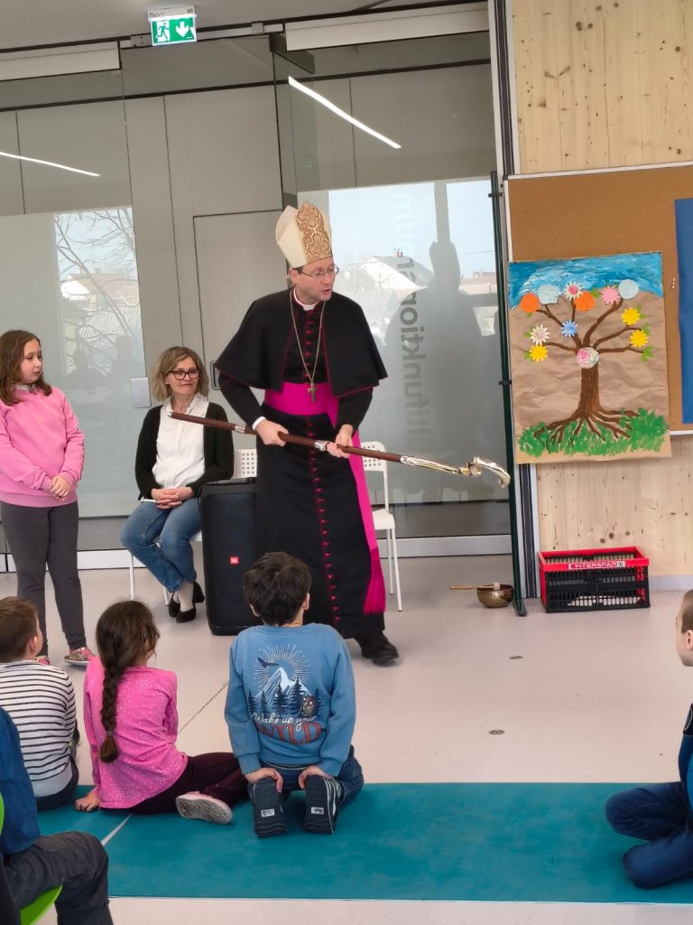Am 25.2. besuchte Weihbischof Stephan Turnovszky unsere Schule. Die Schülerinnen und Schüler aller Klassen präsentierten im Rahmen dieser Bischofsvisitation unter der Leitung von Religionslehrerin Sabine Bartosch Rollenspiele und Plakate zu verschiedenen Themen aus dem Leben Jesu, mit denen sie sich vorher im Unterricht beschäftigt haben. Auch einige Lieder wurden gemeinsam gesungen. Bischof Turnovszky suchte danach das Gespräch mit den Kindern und zeigte ihnen auch seine Bischofsinsignien. Kinder, die ein anderes oder kein Religionsbekenntnis haben, konnten als Zuseher dabei sein.