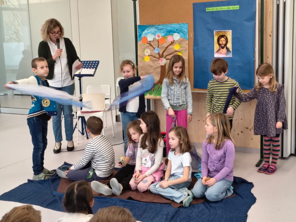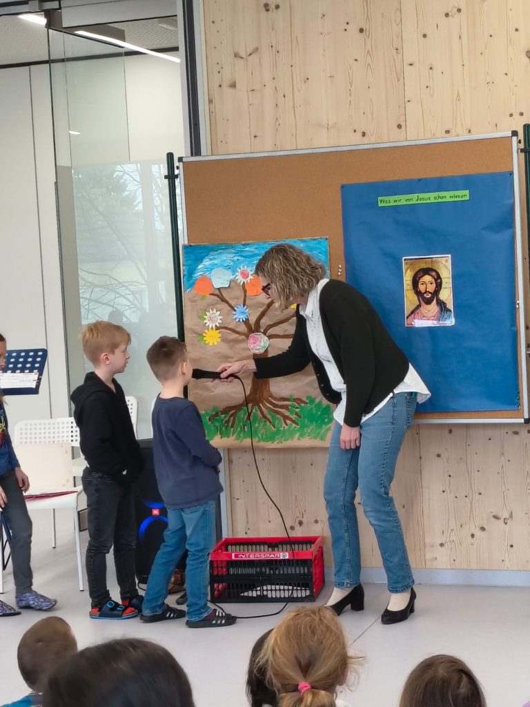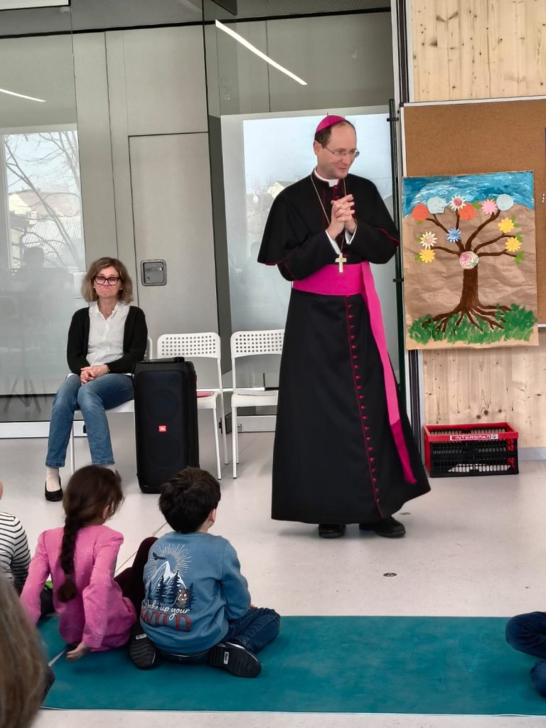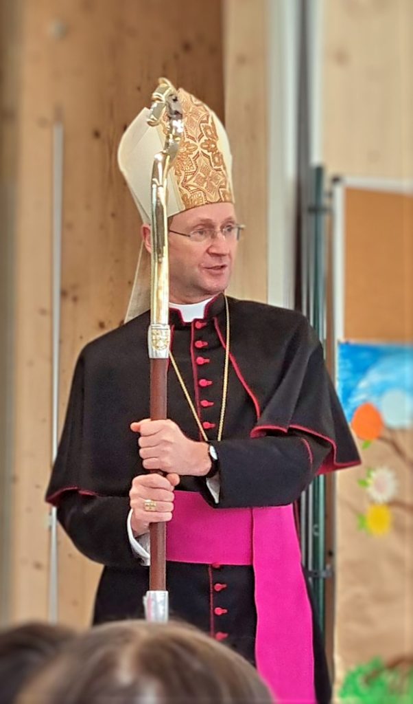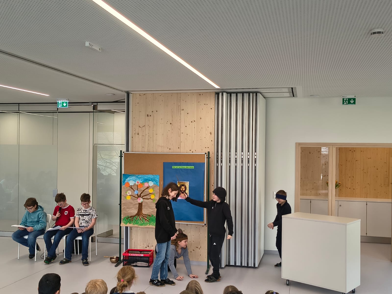 Am 25.2. besuchte Weihbischof Stephan Turnovszky unsere Schule. Die Schülerinnen und Schüler aller Klassen präsentierten im Rahmen dieser Bischofsvisitation unter der Leitung von Religionslehrerin Sabine Bartosch Rollenspiele und Plakate zu verschiedenen Themen aus dem Leben Jesu, mit denen sie sich vorher im Unterricht beschäftigt haben. Auch einige Lieder wurden gemeinsam gesungen. Bischof Turnovszky suchte danach das Gespräch mit den Kindern und zeigte ihnen auch seine Bischofsinsignien. Kinder, die ein anderes oder kein Religionsbekenntnis haben, konnten als Zuseher dabei sein.